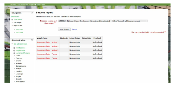 This plugin has been developed on request from Fit Education College, AU. The plugin allows admins to choose a course and a student. Then, it displays the following details about the assignments in the course: